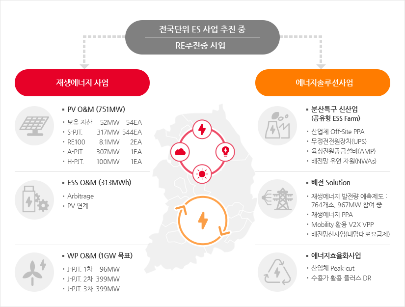 에너지 패러다임 변화 속에서 재생에너지 발전의 간헐성 문제 및 Grid Infra 부담 증가, 전력 소비 다양성 등 Pain-point를 해결하기 위해 국내 최대 규모의 민간 배전망 및 재생에너지, 국내/외 ESS 및 전력 사용 고객을 기반으로 Energy Solution 사업을 추진 중에 있습니다.