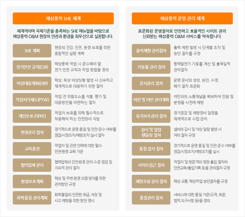 - 해상풍력 발전단지 운영 - BOP 설비 운영 및 유지보수 - 주기기 LTSA 관리 등 |