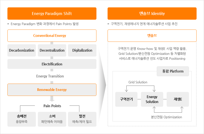Energy Paradigm 변화 과정에서 발전/송배전/소비 등 전략시장 V/C 전반에 걸친 Pain Points를 해소하고, 특히 엔솔브 배전망 운영 경험/역량을 기반으로 다양한 발전 Mix 연계형 에너지솔루션 사업자로 전환하고 있습니다