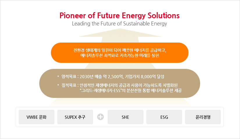 구역전기사업을 기반으로 PV EPC 및 O&M, ESS, 해상풍력 O&M 사업을 통해 안정적인 Cash 확보하고, 그리드-재생에너지-ESS 분산전원 통합 Platform을 구착해 All-in-One Energy Solution Provider로 성장하고자 합니다.