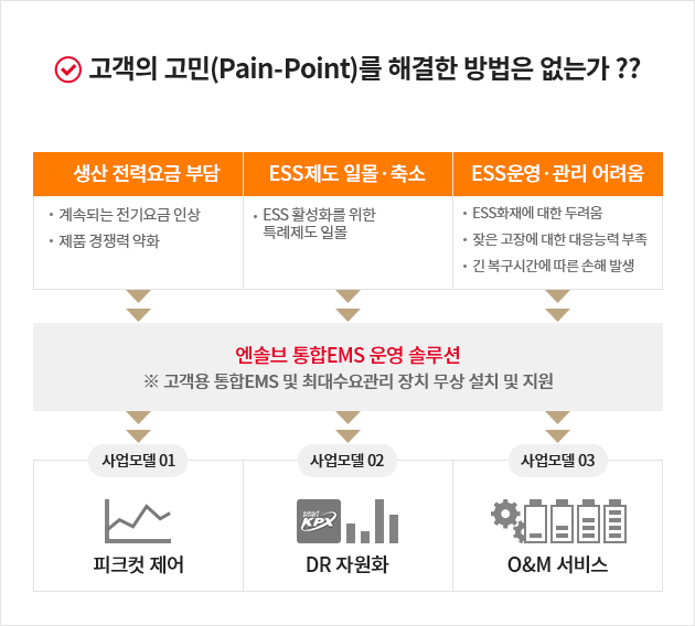 엔솔브는 구역전기사업과 더불어 다양한 분산자원을 자체 보유하고 있으며, S/W 플랫폼을 활용한 다양한 사업모델을 개발하고 실증할 수 있는 국내 유일한 에너지솔루션 사업자입니다.