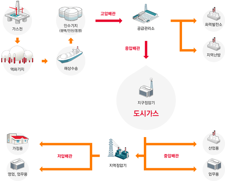 한국가스공사(KOGAS)로부터 천연가스를 공급받아 지구 및 지역 정압기를 거쳐 일반 수요처에 공급하고 있습니다.