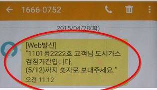 1. 검침일에 도시가스 고객센터(1666-0752)에서 고객님께 검침 요청 문자를 발송 합니다.