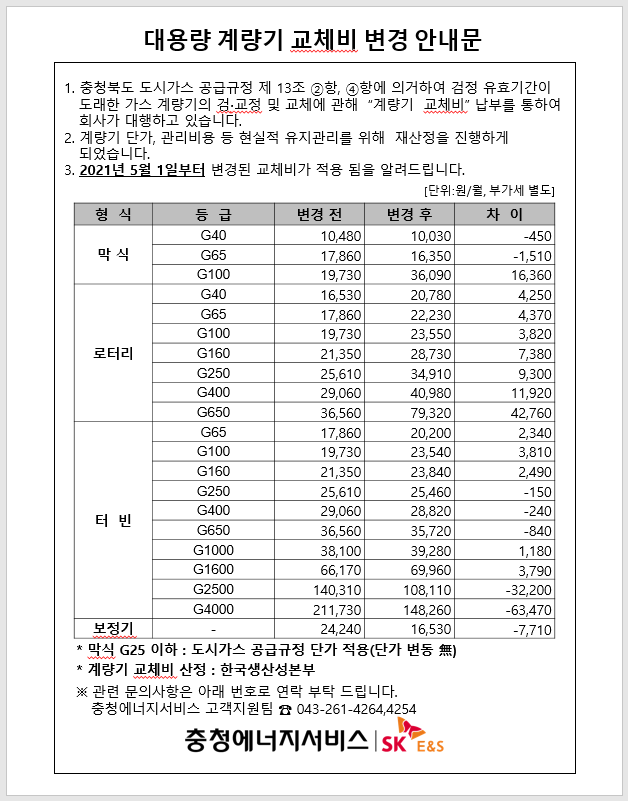 대용량 계량기 교체비 변경 안내 (2021년 5월 1일부)